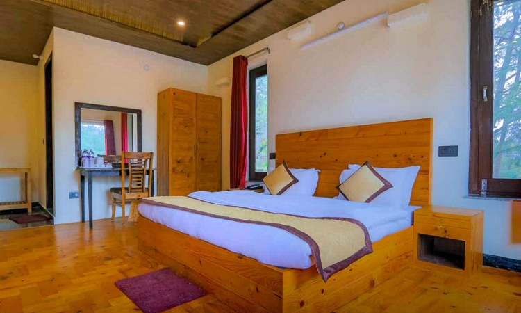 The Tree of Heaven Room at The Mountain Paradise Resort in Almora offers a luxurious stay with a private balcony and stunning valley views. Spanning approximately 250 sq. ft., this room features a king-sized bed, modern amenities, and elegant interiors